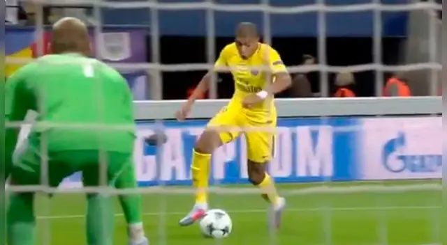 Todos pensaron que iba a centrar peroKylian Mbappé sorprendió al golero metiendo el balón entre sus piernas. Es el segundo gol del francés por la Champions League