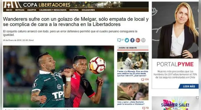 Al Melgar le costó mucho trabajo conseguir el empate (1-1) frente al Santiago Wanderers en el debut por la Copa Libertadores. Los 'rojinegros' lograron un brillante resultado para la vuelta en Arequipa y sueñan con la clasificación a la fase de grupos del torneo. La prensa del país vecino también informó del juego disputado en el Elías Figueroa Brander de Valparaíso.