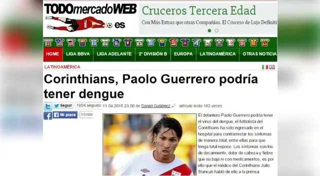 Tras las primeras revisiones a Paolo Guerrero, el Corinthians confirmó que el delantero peruano contrajo el dengue y se perdería varios partidos con su club.El primer parte médico del hospital de San Luiz de Sao Paulo, donde se encuentra Paolo Guerrero, confirma la enfermedad que ayer anunció el diario Lance de Brasil.“Según las evaluaciones clínicas y de laboratorio llevadas a cabo diariamente, el jugador tiene dengue, pero el diagnóstico todavía no es completo. El paciente se encuentra bien y no hay previsión de alta”, indica el boletín.Paolo Guerrero fue internado este sábado 12 de abril en horas de la mañana tras amanecer con una fiebre muy alta, que permitió que se le práctique exámenes médicos que confirmaron tiene dengue.El delantero peruano se perdió el partido ante Ponte Preta, que ganó Corinthians por 1-0, y previsiblemente se perderá las instancias finales del Paulistao y la toda la fase de grupos de la Copa Libertadores.EL DATO:Paolo Guerrero lleva 10 goles con el Corinthians en 2015 (6 por Paulistao y 4 por la Libertadores).