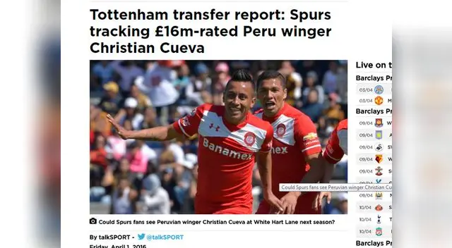 Hace unos días se informó sobre la posibilidad de que el peruano Christian Cueva emigre a la Premier League. Pues bien, hoy el medio inglés talksport, dio más detalles de la negociación del jugador del Toluca mexicano.