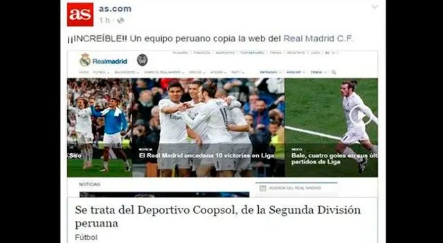 “¿Coincidencia? Imposible. El club peruano de segunda división, Deportivo Coopsol, lanzó hace poco su moderna página web y tiene muchas similitudes con las de Real Madrid”, refiere el medio español.