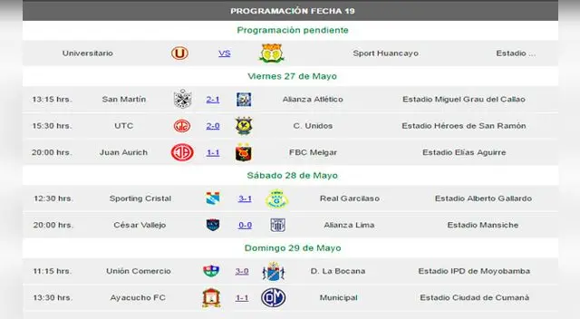 El Torneo Clausura volvió al ruedo este viernes con la última fecha antes de que el campeonato se vaya al receso por la Copa América Centenario.TAMBIÉN LEE: André Carrillo en la órbita del Manchester UnitedPor el primer triunfo. El líder del acumulado Universitario recibe a Sport Huancayo con la consigna de sumar de a tres para mantenerse en lo más alto y seguir camino rumbo al título nacional.
