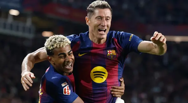 Asistencia sensacional de Lamine Yamal para que el goleador polaco remate de cabeza y remonte el marcador ante Real Sociedad.