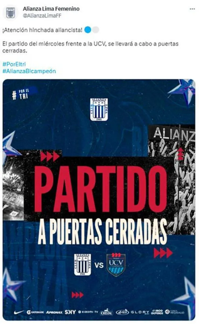 Las futbolistas íntimas vienen de obtener el bicampeonato y todo el pueblo aliancista está ilusionado con el 'tri'. No obstante, por ello mismo en Twitter se pudo ver la molestia por el hecho de que el duelo ante las trujillanas se juegue a puertas cerradas.