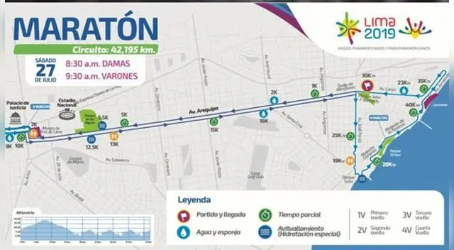 La largada para categoría damas es a las 8:30 a.m. y la de varones comenzará una hora más tarde (9:30 a.m.). Como parte del recorrido, los atletas deberá correr por la avenida Arequipa, rumbo al centro de Lima, y el retorno será por la avenida Arequipa, los malecones de la Reserva y Cisneros, y las avenidas Armendáriz, Larco, hasta la meta final ubicada en el Parque Kennedy.