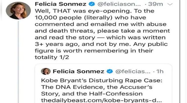 La leyenda de la NBA y del deporte en general, Kobe Bryant, falleció el domingo pasado en un lamentable accidente en su helicóptero. El hecho causó gran revuelo y conmoción en el mundo entero, sin embargo, Felicia Sonmez, periodista del Washintong Post, no tuvo mejor idea que recordar una grave denuncia hacia el ex basquetbolista, causando la indignación del planeta entero.