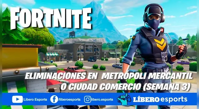 Este lugar goza de cierta popularidad por sus amplias opciones de cobertura y loot. Recordemos que Metrópoli Mercantil (o Ciudad Comercio) se ubica en la parte central de la isla, exactamente ocupando mayomente el cuadrante G6 y H6. Este será el escenario para este desafío, el cual involucra que registres exactamente 3 eliminaciones en sus instalaciones.