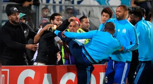 Los hinchas del Marsella habían bajado al borde del campo para encarar a los futbolistas franceses aparentemente por su flojo rendimiento, pero el lateral Evra terminó dando una patada voladora a un hinchas, al mismo estilo de Cantona a un hincha del Crystal Palace.
