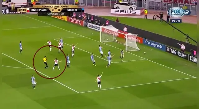 Un partido caliente se vive en el Estadio Monumental de Núñez, donde River Plate busca sacar ventaja en la llave de semifinales ante Gremio. El partido no había tenido muchas ocasiones de gol en la primera parte, pero el 'Millonario' intentaba por todos los medios encontrar el primer gol en el marcador y sucedió una jugada complicada para el juez.