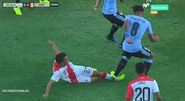 En el Perú vs Uruguay, el mediocampista nacional Walter Tandazo recibió una terrible plancha en su pierna izquierda de Rodrigo Zalazar, pero el árbitro no sacó ninguna tarjeta.