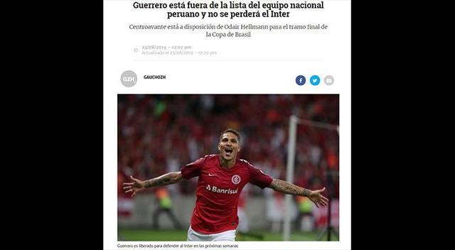 Por ello, los portales deportivos más importantes del país de la samba se pronunciaron respecto a la ausencia de Paolo Guerrero y destacaron que Internacional de Porto Alegre podrá contar con el delantero peruano para disputar la semifinal de la Copa Brasil.