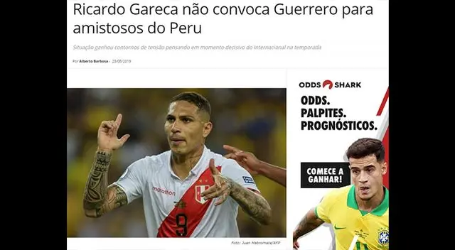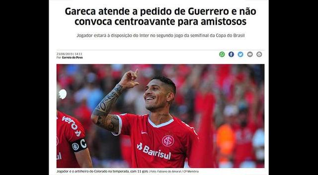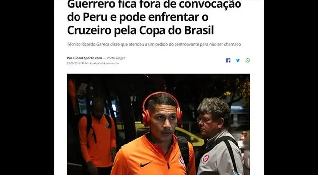 Por ejemplo, GloboEspote resaltó esta noticia por el lado que Ricardo Gareca accedió al pedido del jugador para no ser parte de la convocatoria de la Selección Peruana: “Guerrero está fuera del equipo de Perú y podría enfrentar el Cruzeiro por la Copa Brasil”, resaltó el portal.