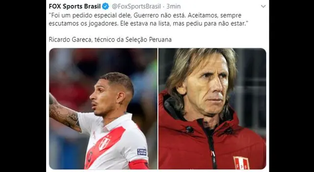 “Fue una petición especial de él, Guerrero por eso no está. Aceptamos, siempre escuchamos a los jugadores. Él estaba en la lista, pero decidió no estar”, indicó el medio brasileño. Sin duda una decisión de Ricardo Gareca que abrirá la polémica por el pedido del atacante nacional de no estar en esta lista pese a ser el capitán de la Selección.