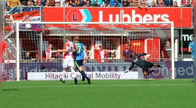 En duelo de peruanos, Renato Tapia (por Feyenoord) y Sergio Peña (Emmen), este último sacó de la galera un potente remate para vencer la resistencia del guardameta holandés Kenneth Vermeer, quien a pesar de estirarse, no llegó.