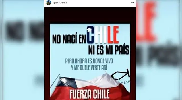“No nací en Chile ni es mi país, pero ahora es donde vivo y me duele verte así. ¡Fuerza Chile!”, fue lo que escribió Gabriel Costa en su cuenta de Instagram. El mensaje del reciente convocado por Ricardo Gareca estuvo acompañado de un emoji que simboliza la fuerza ante el mal momento.