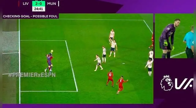 Liverpool vs Manchester United | Roberto Firmino había anotado el 2-0, pero fue invalidado por una falta de Van Dijk sobre De Gea.