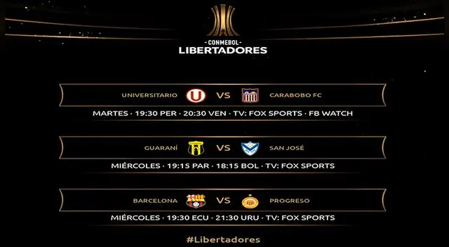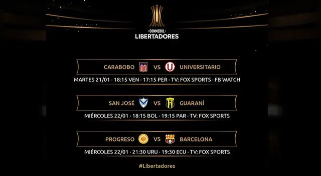 Universitario 1-0 Carabobo FC Martes 28 de enero | 19:30 Peru - 20:30 VenezuelaTV Fox Sports - Facebook Watch