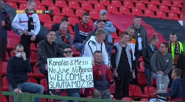 “Ronaldo & Messi: No Juve, no Barcelona... Bienvendos al Slavia Mozyr”, fue el mensaje que pudo captar la señal a cargo de la transmisión en una de las tribunas del Stadion Junosť. El animado hincha, acompañado de algunas sonrisas cómplices, tiene ese gran sueño.
