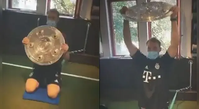 Primer de rodillas, elevándolos en repetidas ocasiones. Luego, apareció recostado y empezó a hacer flexiones, teniendo el trofeo de la Bundesliga en las manos. Las imágenes han causado furor en las redes sociales, en especial entre los hinchas del poderoso Bayern Munich.