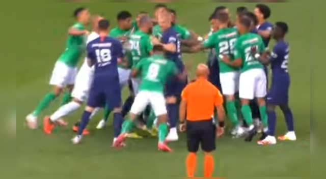 Ante ello, los jugadores del PSG reclamaron la acción vehemente del capitán del Saint-Étienne, pero ello generó que sus compañeros saltasen a su favor y fue así que se terminó por armar una bronca en el campo.
