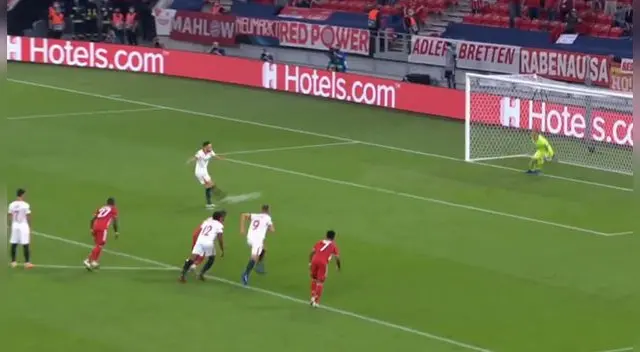La habilitación del ahora lateral español llegó a la cabeza de Luuk De Jong, quien solo bajó el balón de cabeza al centro del área chica, por donde llegaba Ivan Rakitic. El croata tenía un gran envión para poder anotar la ventaja del Sevillla, pero David Alaba se le impidió con un leve empujón.