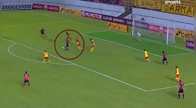 Con una gran lectura de lo que venía ocurriendo dentro del área, Bernardo Cuesta decidió retroceder unos metros y precisamente ahí fue el balón a media altura. El goleador de Melgar en la Copa Sudamericana controló, pero todavía debía resolver un problema: estaba de espaldas al arco ecuatoriano.