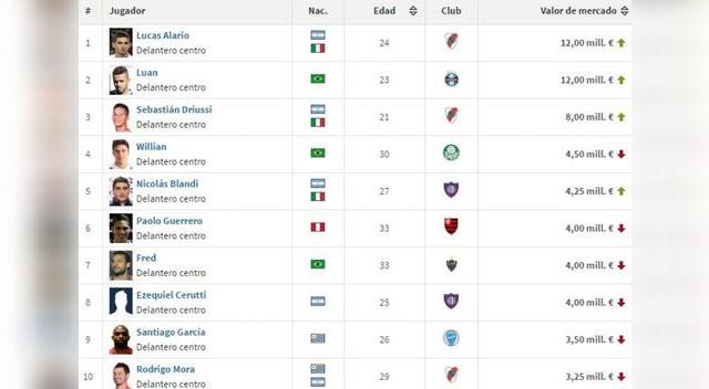 'Transfermarkt', portal internacional encargado de tazar jugadores, hizo una lista de 172 jugadores donde figura el delantero del River Plate, Lucas Alario con un valor de 12 millones de euros. Lo sigue Luan del Gremio con el mismo precio.