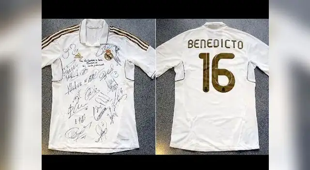 La visita que realizó Benedicto XVI a la ciudad madrileña fue aprovechada por los integrantes del Real Madrid para hacerle llegar un pequeño obsequio, el cual fue la camiseta oficial del cuadro blanco que llevó el nombre de Benedicto y el número 16, en alusión al Papa.