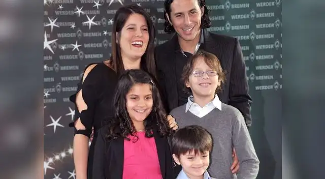El delantero peruano Claudio Pizarro posó para una postal junto a su esposa Karla, su hija Antonella y sus hijos Claudio y Gian Luca a su llegada a la fiesta.