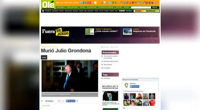 Varios medios argentinos lo dan por hecho. Julio Grondona murió en su natal Argentina, en la capital Buenos Aires, a los 82 años, producto de una insuficiencia cardiaca. Según periodistas, mediante sus cuentas en redes sociales, el presidente de la Asociación de Fútbol Argentina (AFA) fue internado ayer tras sufrir una descompensación y su situación fue decayendo.
