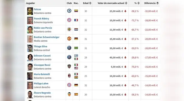 Otro caso también son los de Van Persie y Ribéry, quien por sus lesiones han bajado considerablemente su valor en el mercado.