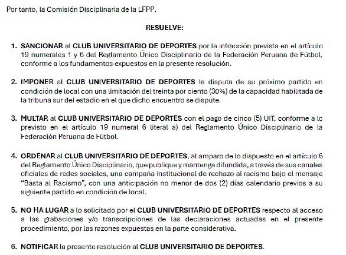 A pocos minutos de su debut en la Copa Libertadores 2026, la gente de Universitario fue castigada por la comisión disciplinaria de la Liga 1, que le impuso la reducción del 30% del aforo en la tribuna sur para su próximo partido como local.Además, se le impuso una multa de 5 UIT y la obligación de realizar una campaña contra el racismo.