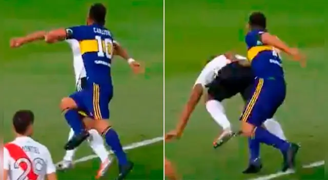 En la repetición se ve claramente la falta del jugador de Boca Juniors, que empuja con los puños a su adversario provocando su caída.