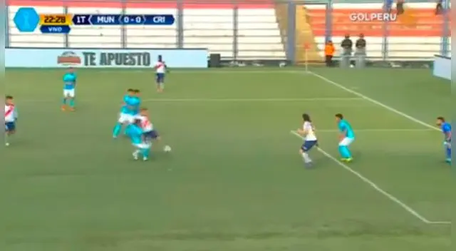 Deportivo Municipal se puso arriba del marcador a los 32' del primer tiempo por intermedio de un penal que convirtió Pablo Lavanderia sobre el arco de Sporting Cristal; sin embargo, antes, el uruguayo tuvo en sus píes un gol que falló de forma increíble.