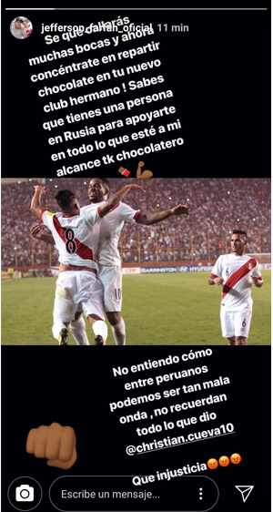 A través de su cuenta de Instagram el atacante del Lokomotiv se mostró indignado con el actuar del hincha y se cuestionó la mala actitud que puede haber entre compatriotas: “No entiendo como entre peruanos podemos ser tan mal onda, no recuerdan todo lo que dio Christian Cueva. Que injusticia”.