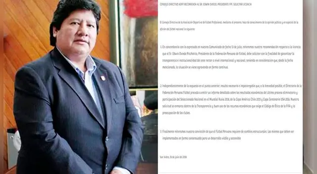 1. En concordancia con lo expresado en nuestro Comunicado de fecha 13 de julio, reiteramos nuestra recomendación respecto a la licencia que el Sr. Edwin Oviedo Picchotito, Presidente de la Federación Peruana de Fútbol, debe solicitar con la finalidad de garantizar la transparencia e institucionalidad del ente rector a nivel internacional y nacional, teniendo en consideración que, desde la fecha mencionada, la situación se viene agravando en forma continua.