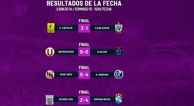 Mientras tanto, el domingo a primera hora, Sport Boys no pudo de local y sucumbió 4-0 ante Deportivo Municipal. Y, para el cierre deportivo, se jugó el partido más esperado de la jornada 12 entre Alianza Lima vs Sporting Cristal en el coloso de Matute.
