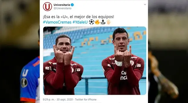 Pues hoy, ocurrió lo mismo en su red social. El partido de Alianza Lima terminó a las 21:27 horas y a las 21:29 horas, apareció una publicación de la U. ¡Esa es la «U», el mejor de los equipos! #VamosCremas #YdaleU, con la imagen de Dos Dantos y Alonso, autores del los goles ante Municipal.