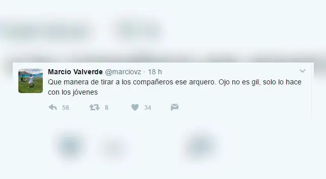 Desde su cuenta de Twitter, Marcio Valverde, actual jugador de Real Garcilaso, opinó sobre la actitud del golero chileno. "Qué manera de tirar a los compañeros ese arquero. Ojo no es gil, solo lo hace con los jóvenes", publicó el lateral cusqueños.