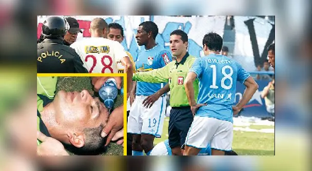 Corría el minuto 33’ del segundo tiempo, instante en el que el juez Pacheco se disponía a sancionar con tarjeta roja a Piero Alva, cuando desde la tribuna le tiraron un objeto que por el impacto lo hizo caer.Las acciones se paralizaron cerca de siete minutos y el réferi, quien perdió el conocimiento, recibió atención de los médicos de la “U” y Cristal. Se pensó que Pacheco suspendería el encuentro, sin embargo, se repuso y tras dialogar con el comisario del partido Alberto Castillo decidió reiniciar el juego, pero antes expulsó al “Zorro” Alva.“Voy a elevar un informe a la Comisión de Justicia para evitar que esto se repita. Me tiraron una cosa contundente que me hizo un hematoma, y no fue teatro”, indicó Pacheco, quien podría pedir veto para el estadio.