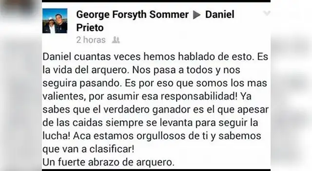 El portero de Alianza Lima, George Forsyth, le dedicó un mensaje de aliento a Daniel Prieto tras la dura goleada 6-2 ante Argentina en el Sudamericano Sub-20.Daniel Prieto, el arquero de la Selección Peruana Sub-20, fue uno de los principales señalados en la derrota nacional ante Argentina tras su error en el primer gol y se ganó varias críticas por su baja actuación, no obstante, también recibió el apoyo de varios futbolistas, incluido su compañero en Alianza Lima, George Forsyth.“Daniel cuantas veces hemos hablado de esto. Es la vida del arquero, Nos pasa a todos y nos seguirá pasando. Es por eso que somos los más valientes, por asumir esa responsabilidad”, le escribió Forsyth a Prieto a través de su cuenta de Facebook.“Ya sabes que el verdadero ganador es el que a pesar de las caídas siempre se levanta para seguir la lucha. Acá estamos orgullosos de ti y sabemos que van a clasificar. Un fuerte abrazo de arquero”, finalizó el mensaje del capitán de Alianza.Daniel Prieto pidió disculpas al país tras su baja performance en la caída ante Argentina y espera resarcirse de sus errores en el próximo partido ante Bolivia.TAMBIÉN TE PUEDE INTERESAR: