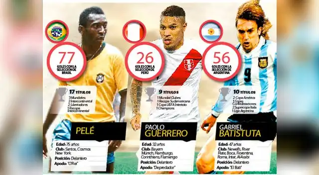 Paolo Guerrero, Pelé y Gabriel Batistuta los grandes goleadores de sus selecciones