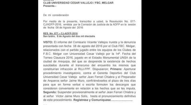 La resolución No. 077 – CJ-ADFP-2016 señala que se decidió abrirles un procedimiento investigatorio a ambos, confiriéndoseles el plazo de tres días para formular sus descargos; no obstante, serán suspendidos provisionalmente. Este determinación no cayó nada bien en el seno 'poeta', que señaló que se defenderán e, incluso, prepararían una contrademanda hacia sus pares characatos.