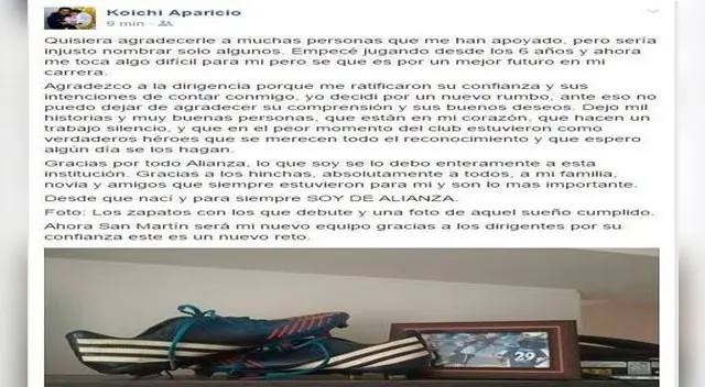 San Martín sigue reforzando lineas para la próxima temporada y contrató de manera oficial a su primer fichaje, Koichi Aparacio quien utilizó sus redes sociales para despedirse de Alianza Lima.