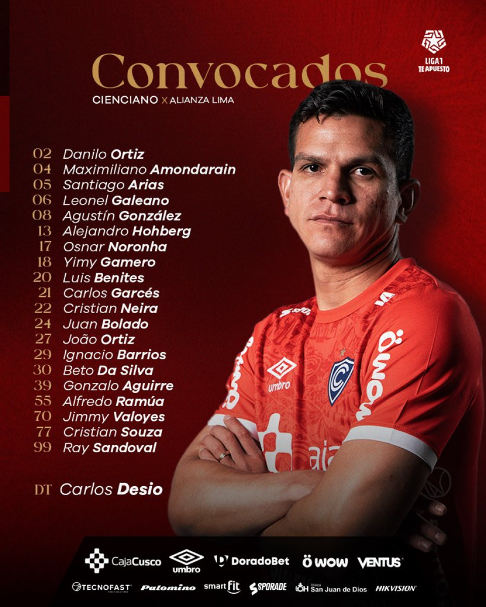 - Posible alineación de Cienciano: Juan Cruz Bolado; Maximiliano Amondaraín, Leonel Galeano, Danilo Ortiz, Jimmy Valoyes; Cristian Neira, Santiago Arias, Agustín González, Cristian Souza; Alejandro Hohberg y Carlos Garcés.