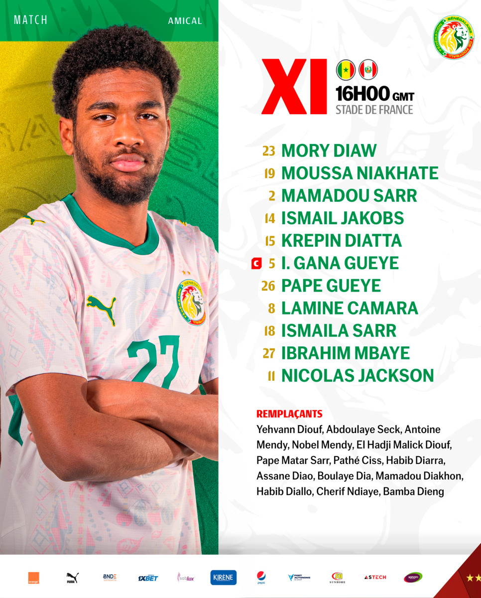 Alineación de Senegal: Mory Diaw; Moussa Niakhaté, Mamadou Sarr, Ismail Jakobs, Krepin Diatta, I. Gana Gueye, Pape Gueye, Lamine Camara, Ismaila Sarr, Ibrahim Mbaye y Nicolás Jackson.