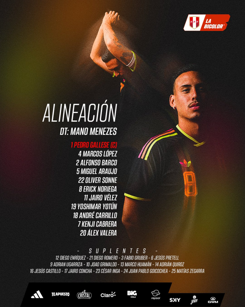 Esta es la alineación de la selección peruana: Pedro Gallese, Marcos López, Alfonso Barco, Miguel Araujo, Oliver Sonne, Erick Noriega, Jairo Vélez, Yoshimar Yotún, André Carrillo, Kenji Cabrera y Álex Valera.