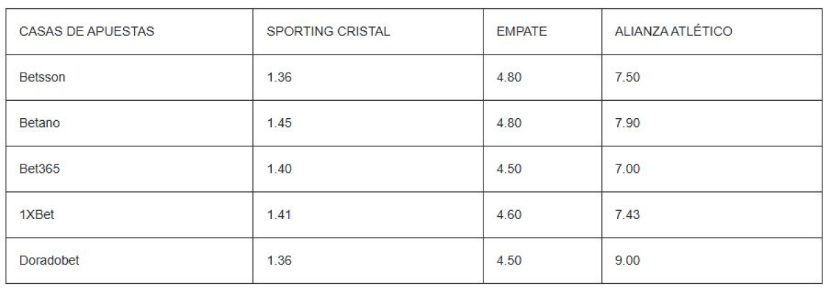 CASAS DE APUESTAS | SPORTING CRISTAL | EMPATE | ALIANZA ATLÉTICO |