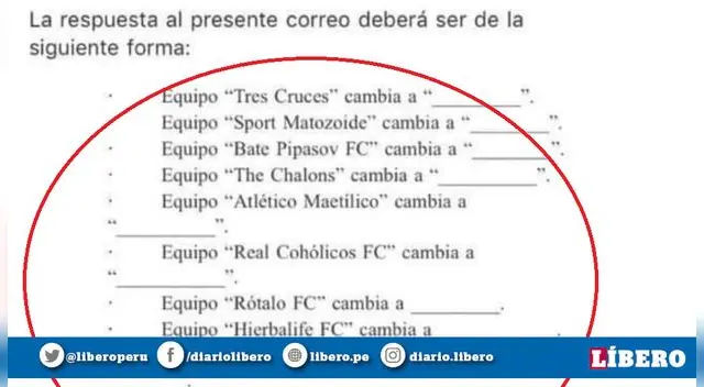 - Equipo "Tres Cruces" cambia a "___________"- Equipo "Sport Matozoide" cambia a "___________"- Equipo "Bate Pipasov FC" cambia a "___________"- Equipo "Atlético Maetílico" cambia a "___________"- Equipo "Real Cohólicos FC" cambia a "___________"- Equipo "Rótalo FC" cambia a "___________"- Equipo "Hierbalife" cambia "___________"- Equipo "El Secreto de Kukin" cambia a "___________"- Equipo "Real Mandrink" cambia a "___________"- Equipo "Rechuchaboys" cambia a "___________"- Equipo "Stone City" cambia a "___________"- Equiipo "Ajaxcucho" cambia a "___________"