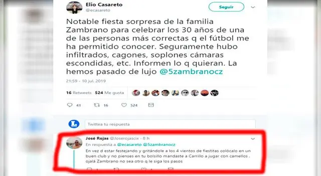 Elio Casareto utilizó fuertes palabras a los críticos de la fiesta de Carlos Zambrano. "Notable fiesta sorpresa de la familia Zambrano para celebrar los 30 años de una de las personas más correctas que el fútbol me ha permitido conocer. Seguramente hubo infiltrados, cagones, soplones cámaras escondidas, etc. Informen lo que quieran. La hemos pasado de lujo", publicó el agente FIFA en Twitter.